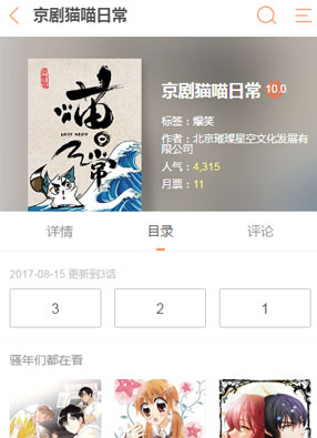 简介: 漫画《京剧猫喵日常》简介:软萌有趣的猫咪日常,等你来撩喵~!逗比萌白糖,闷骚帅武崧,毒舌俏小青,暖男胖大飞……他们是身怀绝技的京剧猫,也是糊涂可爱的小萌猫~快来看看他们的萌趣日常吧!